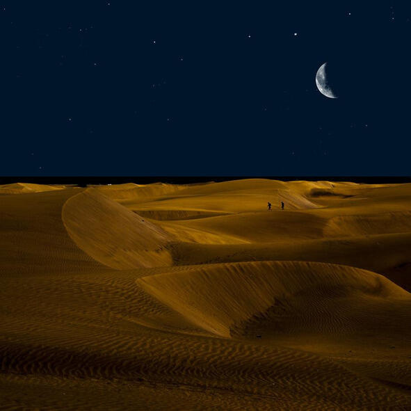 Появившаяся из-за горизонта луна, начала освещать территорию комплекса и уходящую к горизонту пустыню. Точнее это был полумесяц, располагавшийся на небе необычно рогами вверх. Он довольно быстро из красноватого стал желтым, а еще через пару минут засиял серебром. На черном, усыпанном звездами небе светилось некое рогатое чудо. Прямо, как в арабских сказках, подумал я.