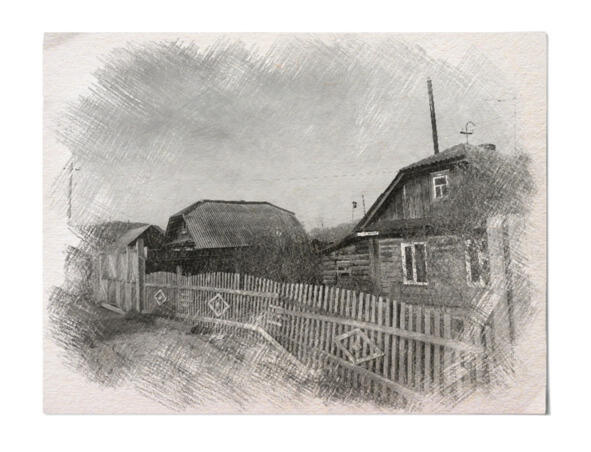 Бабушка берет свою клеенчатую сумку, они выходят в сени, потом на крыльцо, закрывают дверь на большой навесной замок. Иринка бежит к Дозорке, сует ему угощение, а потом к калитке.