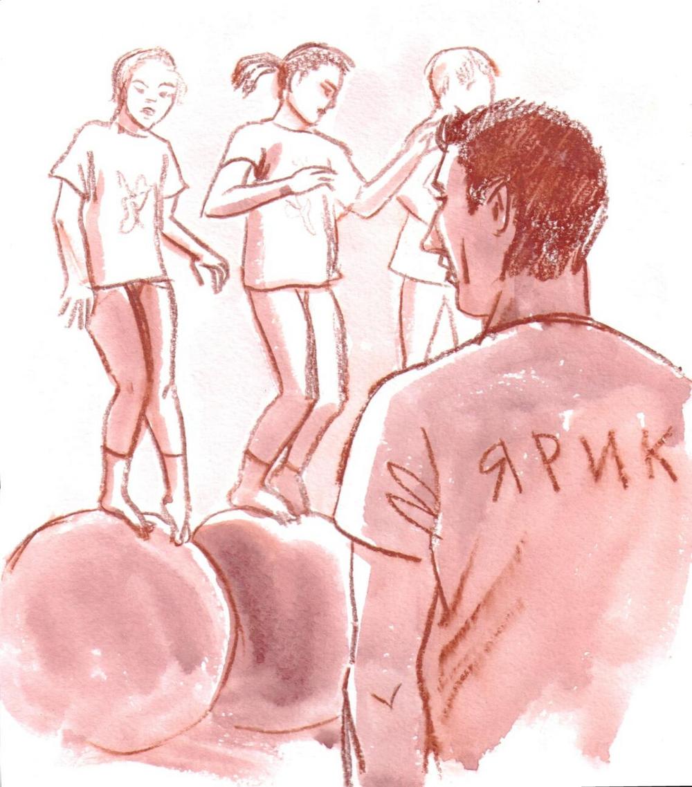 А я застеснялась и все никак не могла придумать свое движение. А тренер Ярик говорит: «Как тебя зовут?» А я говорю: «Ярослава». И заплела руки как будто в косичку люди так делают, когда стесняются. И Ярик эти заплетенные руки сделал моим движением. И все стали показывать это движение, и делать вид, что они тоже стесняются.