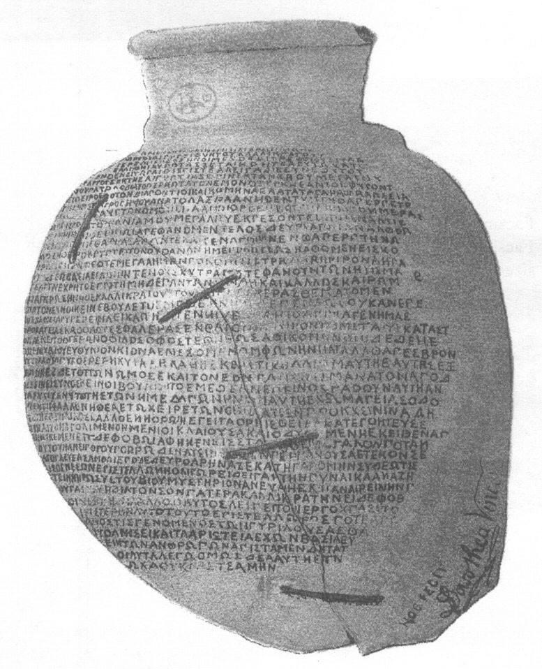 The next thing that I found was a parchment carefully rolled up. I unrolled it, and seeing that it was also in Vinceys handwriting, and headed, Translation of the Uncial Greek Writing on the Potsherd, put it down by the letter. Then followed another ancient roll of parchment, that had become yellow and crinkled with the passage of years. This I also unrolled. It was likewise a translation of the same Greek original, but into black-letter Latin, which at the first glance from the style and character appeared to me to date from somewhere about the beginning of the sixteenth century. Immediately beneath this roll was something hard and heavy, wrapped up in yellow linen, and reposing upon another layer of the fibrous material. Slowly and carefully we unrolled the linen, exposing to view a very large but undoubtedly ancient potsherd of a dirty yellow colour! This potsherd had in my judgment, once been a part of an ordinary amphora of medium size. For the rest, it measured ten and a half inches in length by seven in width, was about a quarter of an inch thick, and densely covered on the convex side that lay towards the bottom of the box with writing in the later uncial Greek character, faded here and there, but for the most part perfectly legible, the inscription having evidently been executed with the greatest care, and by means of a reed pen, such as the ancients often used. I must not forget to mention that in some remote age this wonderful fragment had been broken in two, and rejoined by means of cement and eight long rivets. Also there were numerous inscriptions on the inner side, but these were of the most erratic character, and had clearly been made by different hands and in many different ages, and of them, together with the writings on the parchments, I shall have to speak presently.
