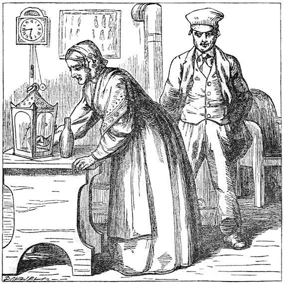 Op zekeren dag kwam er een heele boel eindjes waskaars in den kelder; de grootste eindjes werden gebrand, en de kleinere gebruikte de vrouw om er haar draden mee te wrijven. Er waren dus genoeg waskaarsen voorhanden; maar het kwam de beide oude luidjes niet in de gedachten, een klein eindje in de lantaarn te zetten.
