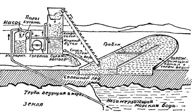 Из-подо льда по трубам, защищённым теплоизолирующим материалом, подаётся внутрь котельного помещения к котлам подлёдная вода. В этих котлах-испарителях жидкий холодный бутан. Вода впрыскивается, и под действием её тепла (а она теплее бутана, хотя имеет всего температуру в 2°) бутан начинает кипеть. Пары его отводятся по трубопроводу в турбину, а вода, у которой холодный бутан отнимает тепло, замерзает и в виде ледяной крупы падает на дно испарителей, откуда непрерывно выгребается (бутан с водой не смешивается). Пары бутана проходят через турбину и приводят её во вращение, поэтому динамо даёт ток. Далее пары бутана попадают в конденсатор холодильник, куда непрерывно подаются куски замёрзшего ледяного рассола с температурой 22°. Охлаждаясь, пары бутана сжимаются, а «солёный лёд» нагревается и тает. Жидкий бутан возвращается по трубам обратно в испаритель. Растаявший ледяной рассол выпускается наружу в бассейны и там снова замерзает под действием низкой температуры окружающего воздуха.