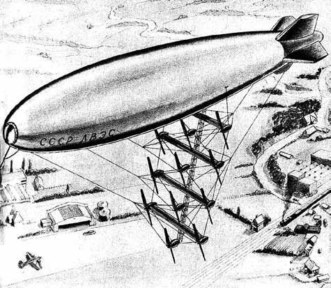 В 1930-е годы активно обсуждалось использование альтернативных видов энергии. В частности использование энергии ветра. Смелый проект представил инженер В. Егоров на страницах журнала «Техника молодёжи» в 1938 году. Он предложил создать мощные ветростанции не на земле, а в воздухе, где на высоте 600700 м над землёй наблюдаются весьма значительные скорости ветра. Ветросиловой агрегат В. Егорова состоял «из двухлопастного ветроколеса, насаженного на один вал с ограничительной муфтой, редуктором и генератором, смонтированными в особом металлическом кожухе, напоминающем по внешности фюзеляж самолёта». Муфта была предназначена «для ограничения вращающего момента при возможных толчках и неожиданных порывах ветра». Редуктор служил «для увеличения числа оборотов, передаваемых от ветроколеса к синхронному генератору переменного тока». Подобную несложную конструкцию ветростанции можно было устанавливать на высокие опоры. Но автор придумал более действенный, по его мнению, способ. Он предложил использовать дирижабли: «К цельнометаллическому корпусу дирижабля подвешивается на стальных тросах система ветросиловых агрегатов. Все агрегаты соединены между собой лёгкими, но весьма прочными металлическими фермами, что препятствует перемещению ветродвигателей друг относительно друга и придаёт жёсткость всей системе подвески в целом. Одновременно эти фермы могут служить и для передвижения обслуживающего персонала»[42].