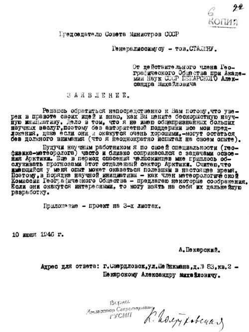 Записка А. М. Пекарского от 10 июня 1946 года