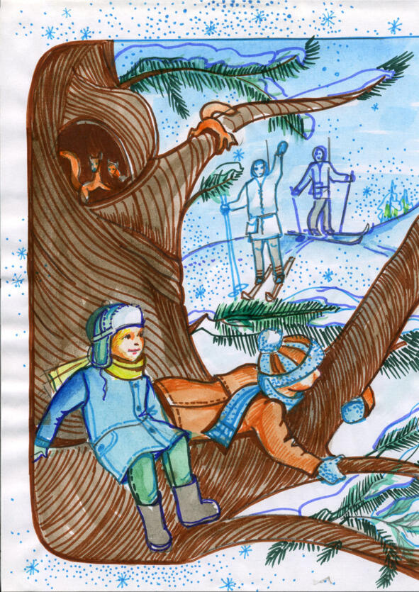Ребята сняли лыжи и стали подниматься вверх как по винтовой лестнице. Чем выше они поднимались, тем отчетливее звучал нежный звон, как будто хрустальные колокольчики звенели. Братишки удобнее уселись на кедровой ветке и стали наблюдать за белками.