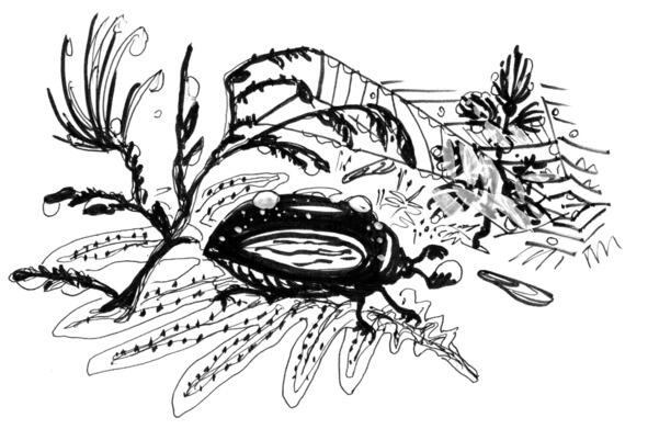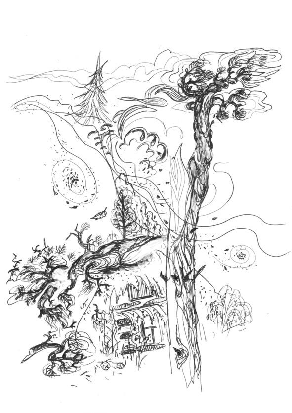 Избушка чуть прогнулась, скрипнув всеми своими деревянными ребрами, потом медленно приподнялась на большущей куриной лапе, покачиваясь, с трудом удерживая равновесие. Пласты мха и дерна посыпались на землю, обнажая странное сооружение. Это была избушка-о-три-окна с дверью под самым изломом крыши. Огромная лапа, на которой стояла избушка, вяло пошевелила пальцами, разминая их после векового сна. При каждом покачивании, домушко издавал такие звуки, по сравнению с которыми завывания Ветра, бесчинствующего в Темном Лесу, казались колыбельной. Потом Ветер внезапно стих, и жуткие вздохи пробуждающегося дома перешли в мерное дыхание. Послышались звуки падающей утвари и какое-то бормотание. Потом громкий чих! Под коньком крыши распахнулась дверь. Из проема показалась голова немолодой женщины, которая тут же скрылась под аккомпанемент грохота.