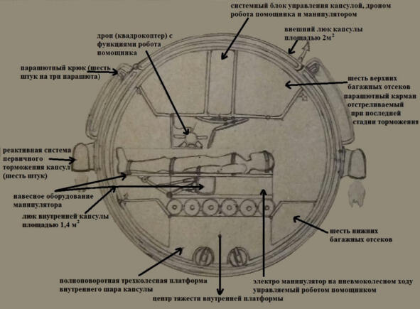 Через несколько секунд я забрался внутрь свой капсулы. Она состояла из внешнего прочного шара диаметром три метра и толщиной стенок около семи сантиметров и внутреннего шара, отделенного от первого на расстояние около пары дюймов и такой же толщины стенками. Внутри было довольно тесно. Внизу и вверху по окружности капсулы располагались двенадцать багажных отсеков, нижние шесть поменьше, а верхние побольше. По центру потолка расположился экран с панелью управления, который можно было выдвинуть при желании через квадратные два люка (внешнего и внутреннего шаров капсулы) на улицу благодаря раздвижному штативу, что я и сделал. «Наверняка в этом компьютере есть информация, которая прольет свет на то, где я и зачем». Я нажал на панели управления кнопку включения: на семнадцатидюймовом сенсорном мониторе показалось видео загрузки данных.
