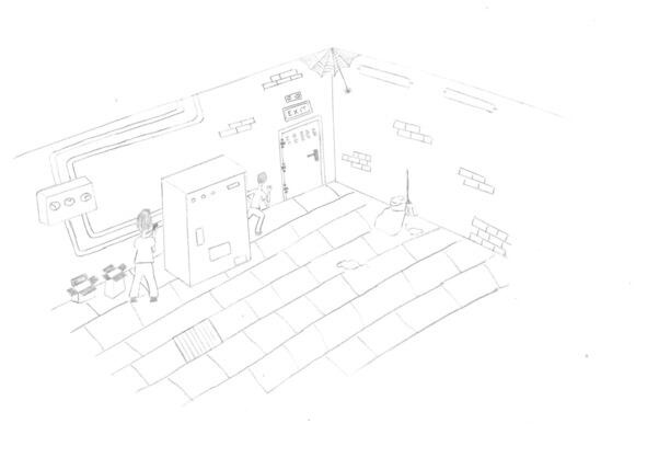 Examina la sala de nuevo, todos y cada uno de los rincones de la oscura habitación; las paredes son de ladrillo, el suelo está lleno de polvo, hay un fuerte olor a humedad, no hay ventanas y las tuberías desaparecen en algún lugar del techo al que no puede llegar. Busca un detector de humos pero no lo encuentra, da una patada13 tras otra a la puerta con todas sus fuerzas, finalmente se rinde y se sienta en el suelo agotado.