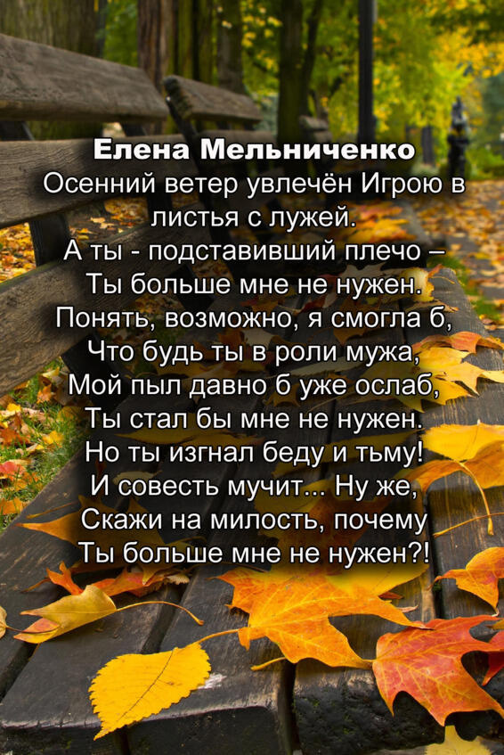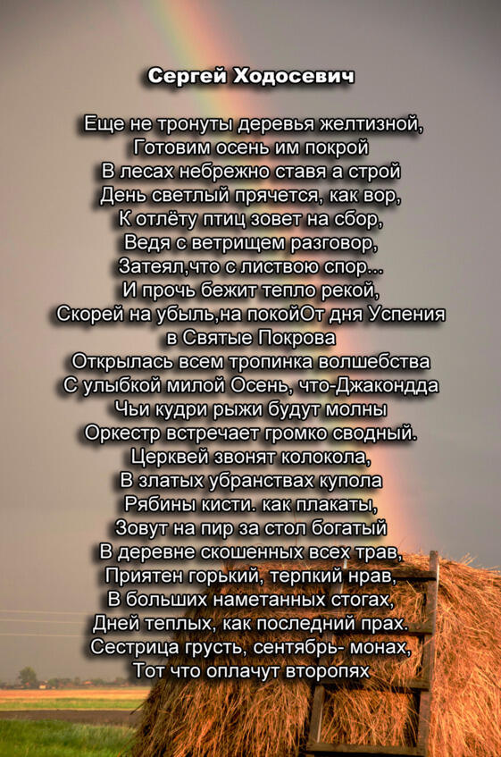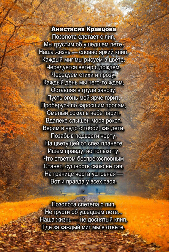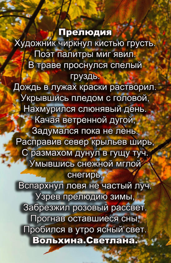 Поэтические страницы « Хроно» В сентябрьском выпуске» Хронометр» мы хотим познакомить вас с творчеством открытой группы «В Контакте», которая зародилась совсем недавно и объединила творческих людей различного направления. Поскольку наш первый выпуск приходится на первый осенний месяц, то мы и открываем его с откровенных посвящений этому прекрасному времени года. Елена Мельниченко, Марина Листок и Анастасия Кравцова, Светлана Вольхина- активные участники группы, а также создатель этой группы и составитель данного издания Сергей Ходосевич представляют вам свои осенние поэтические этюды, прославляющие» рыжую колдунью- Осень»