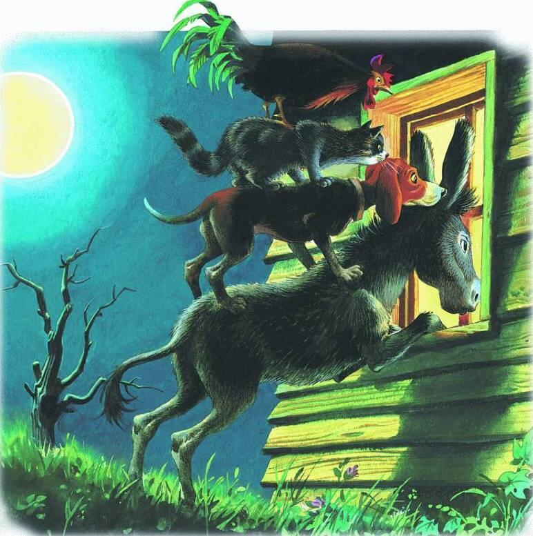 И стало наших друзей четверо. Путь был долгий, и ночь застала их в густом, страшном лесу. Но вскоре они заметили среди деревьев мерцающий огонёк. А ещё немного времени спустя подошли к затерянному в чаще домику. Не долго думая, осёл приподнялся и поставил передние ноги на подоконник, собака запрыгнула ему на спину, кот вскарабкался на собаку, а петух взлетел и сел на кота. И все четверо заглянули в окно.
