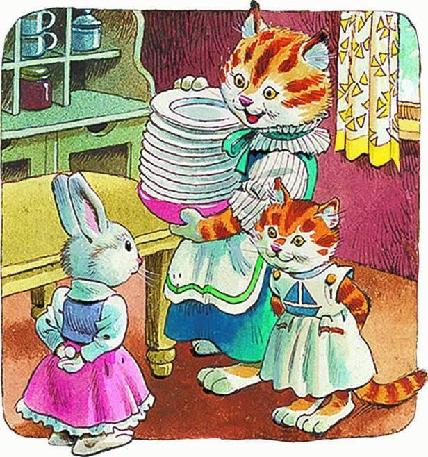 Тогда довольная крольчишка побежала к своей подружке Мурочке за тарелками. Её мама разрешила взять все десять тарелок.
