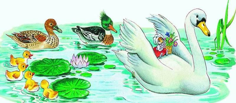 Мышка часто приходила проведывать лебедя, и он катал её по своему озеру.