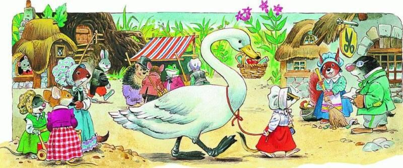 Как только растаял снег и земля подсохла, Чернышка стала выводить Белое Пёрышко на прогулки. Если они отправлялись за покупками, Чернышка привязывала к шее лебедя красный шнурочек, давала ему в клюв корзинку, и они важно шествовали через всю деревню. И вся деревня смотрела на них. «Вот какой помощник появился у нашей Чернышки», думали жители. А некоторые спрашивали: