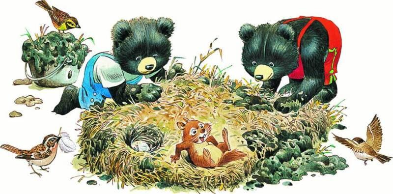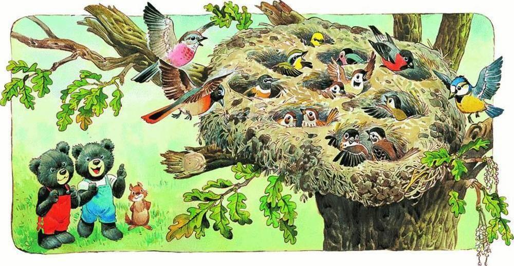 Гнездо сооружали на большой поляне. Тип принёс глину, Топ солому, птицы тащили в клювах веточки, листики и пушинки. Медвежата лепили гнездо, а бурундук помогал уминать глину. К концу дня гнездо было готово. Только как поднять его на большой дуб? Одной птичке не под силу, двум тоже. Даже целая стая не смогла бы его поднять. Но когда слетелись все птицы со всего леса и с соседнего луга гнездо подняли и осторожно положили среди ветвей.