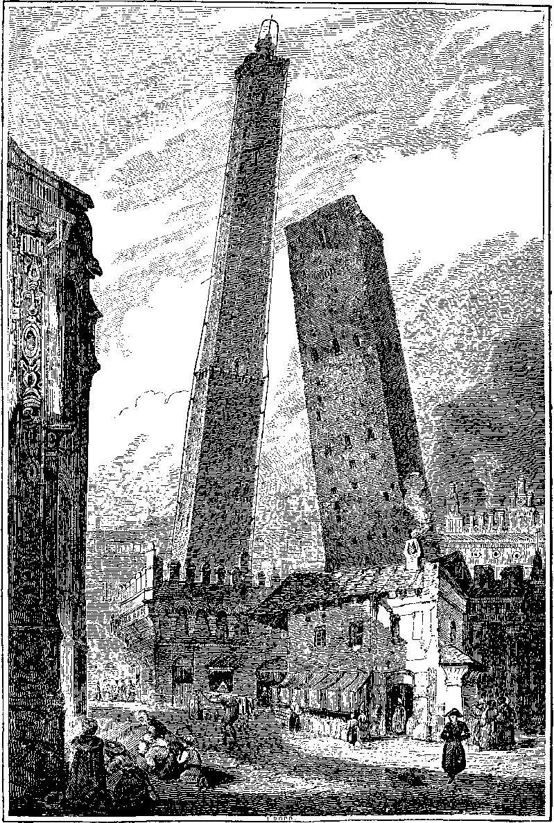 "The tower of the Asinelli rises the height of about 350 feet, and is said to be three feet and a half out of the perpendicular. The adventurous traveller may ascend to the top by a laborious staircase of 500 steps. Those steps were trod by the late amiable and excellent Sir James Edward Smith, who has described the view presented at the summit. 'The day was unfavourable for a view; but we could well distinguish Imola, Ferrara and Modena, as well as the hills about Verona, Mount Baldus, &c., seeming to rise abruptly from the dead flat which extends on three sides of Bologna. On the south are some very pleasant hills stuck with villas.' The Garisenda tower, erected probably by the family of the Garidendi, is about 130 feet in height, and inclines as much as eight feet from the perpendicular. It has been conjectured that these towers were originally constructed as they now appear; but it is difficult to give credit to such a supposition.