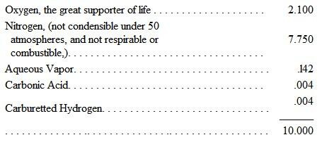 Whether the constituents of the atmosphere are chemically or mechanically combined,one of the things about which the learned are not fully agreed,it is found to be chemically the same in its constituents, all over the world, whether collected on mountains or on plains, on the sea or on the land, whether obtained by aëronauts miles above the earth or by miners in their deepest excavations. On the theory of its mechanical combination, however, as by volume, and that each constituent acts freely for itself and according to its own laws, important speculations (conclusions, indeed) have arisen, both as regards temperature and climatic differences. It should be observed, that volume, as we have used the word, is the apparent space occupied, and differs from mass, which is the effective space occupied, or the real bulk of matter, while density is the relation of mass to volume, or the quotient resulting from the division of the one by the other. Those empty spaces which render the volume larger than the mass are technically called its pores.