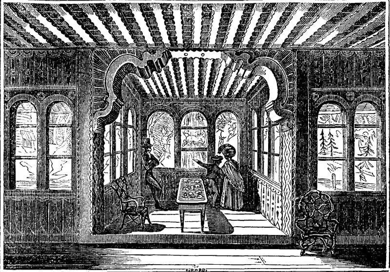 Pictoral History of Londonsuch a faithful display of its myriads of public and private buildingssuch an impression of the vastness, wealth, business, pleasure, commerce, and luxury of the English metropolis, as nothing else can effect. Histories, descriptions, maps, and prints, are all imperfect and defective, when compared to this immense Panoramathey are scraps and mere touches of the pen and pencilwhilst this imparts, at a glance, at one view, a cyclopædia of informationa concentrated historya focal topography, of the largest and most influential city in the world. The immense area of surface which this picture occupies will surprise the reader: it measures 40,000 square feet, or nearly an acre in extent."2 This may be a glowing eulogium; but it is true to the line and letter.We have already illustrated the Panorama,3 and it is our intention to introduce other embellishments of the Colosseum, as far as may be compatible with finished sketches. Our present subject is the principal apartment in the Swiss Cottage, to which the reader or visiter is conducted through a range of conservatories, containing choice exotics, with some of the most majestic proportions of leaf and flower that can be enjoyed in any clime. The communication is by a stone-work passage, the temperature of which is a refreshing succedaneum to that of the conservatories, or 72°. This cottage was designed by P.F. Robinson, Esq. who has evinced considerable taste in a publication on cottages and cottage-villas, as well as in the execution of various buildings. It consists of four apartments, three of which may be considered as finished. The apartment in our Engraving was completed, or nearly so, on our first visit. It is wainscotted with coloured (knotted) wood, and carved in imitation of the ornamented dwelling of a Swiss family. The fire-place will be recognised as the very beau ideal of cottage comfort: the raised hearthstone, massive fire-dogs and chimney-back, and its cosy seats, calculated to contain a whole family seated at the sides of its ample hearthare characteristic of the primitive enjoyments of the happy people from among whom this model was taken. Our view is from the extreme corner, from which point the entrance-passage is shown in the distance.