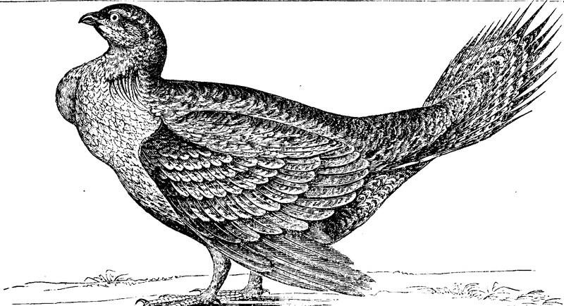 "The flight of these birds is slow, unsteady, and affords but little amusement to the sportsman. From the disproportionately small, convex, thin-quilled, wing,so thin, that a vacant space, half as broad as a quill appears between each,the flight may be said to be a sort of fluttering more than any thing else: the bird giving two or three claps of the wings in quick succession, at the same time hurriedly rising; then shooting or floating, swinging from side to side, gradually falling, and thus producing a clapping, whirring sound. When started, the voice is 'cuck, cuck, cuck,' like the common pheasant. They pair in March and April. The love-song is a confined, grating, but not offensively disagreeable, tone,something that we can imitate, but have a difficulty in expressing'Hurr-hurrhurr-r-r-r hoo,' ending in a deep hollow tone, not unlike the sound produced by blowing into a large reed. Nest on the ground, under the shade of Purshia and Artemisia, or near streams, among Phalaris arundinacea, carefully constructed of dry grass, and slender twigs. Eggs from thirteen to seventeen, about the size of those of a common fowl, of a wood-brown colour, with irregular chocolate blotches on the thick end. The young leave the nest a few hours after they are hatched. In the summer and autumn months these birds are seen in small troops, and in winter and spring in flocks of several hundreds. Plentiful through the barren arid plains of the river Colombia; also in the interior of North California. They do not exist on the banks of the river Missouri; nor have they been seen in any place east of the Rocky Mountains."