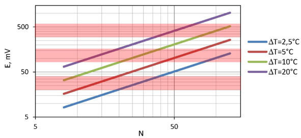 The number of thermoelements 2N in the generator module at the specified temperature difference T and Seebeck coefficient αdetermines the key characteristic total thermoEMF E.