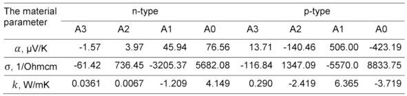 Temperature dependences of properties of the applied thermoelectric materials are described well by a polynomial of the 3rd order of general view as following