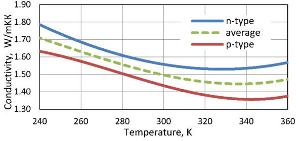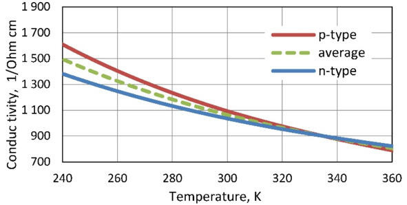 In calculated parameters of thermoelectric microgenerators average characteristics of pair of thermoelements of n-and p-types are applied. Therefore temperature dependences of properties of materials of both n-and p-types and these average dependences are given in Fig. 7.1. Average dependences characterize properties of p-n pair of such thermoelements. In mathematical formulas for parameters of thermoelectric generators such average properties on p-n to pair of thermoelements are just used.