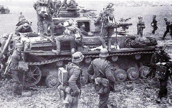 German troops near Vyazma. In the center of the photo the T-4 tank of the first issues with short-barreled 75 mm. tool. Such a cannon is effective in infantry shooting (it is easier to adjust the range of the fragmentation of a fragmentation projectile), but, of course, is ineffective in dealing with heavily armored targets