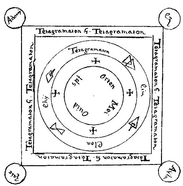 Кроме того, ты должен вписать эти круги в два квадрата, углы которых необходимо сориентировать по четырем сторонам света, расстояние между линиями внешнего и внутреннего квадрата должно составлять половину фута. Крайние углы внешнего квадрата должны стать центрами для четырех кругов, размер или диаметр которых должен составлять один фут. Все их надо изобразить ножом или освященным инструментом магического искусства. И внутри этих четырех кругов ты должен написать четыре Священных Имени Бога в следующем порядке: