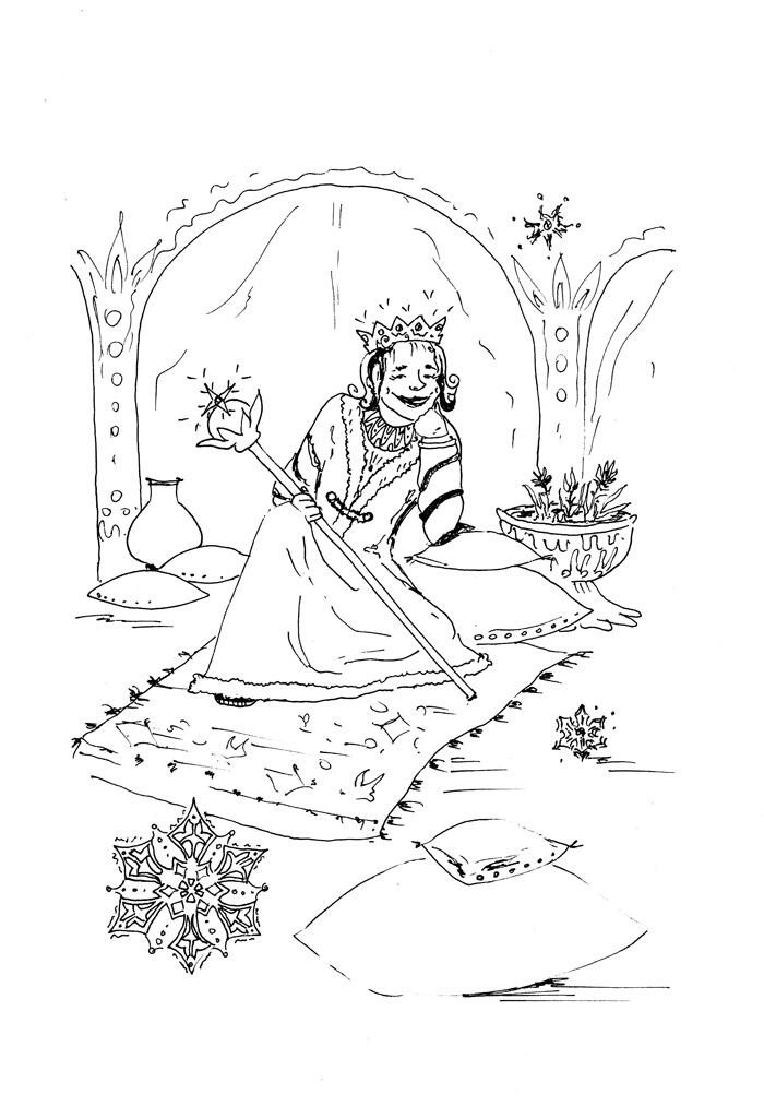 Внизу была пещера, где хранились все снежинки. Вместо двери сияла огромная глыба льда. Данан рассказывал: «Видите, какая красотища! Здесь лед будто горный хрусталь, здесь же и толпы снежинок. Только снежинки эти не простые, а скребущие. Они очень острые и твердые, они могут так щекотать, что все на свете обдерут! А теперь все отойдите за порог этой, потайной двери с толстыми стенками, я возьму самую огненную кочергу и прижгу этот лед!