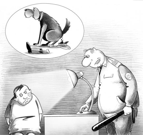 Боря типичный мент а-ля Шариков сидел в углу с разбитым лицом и в порванной рубашке.