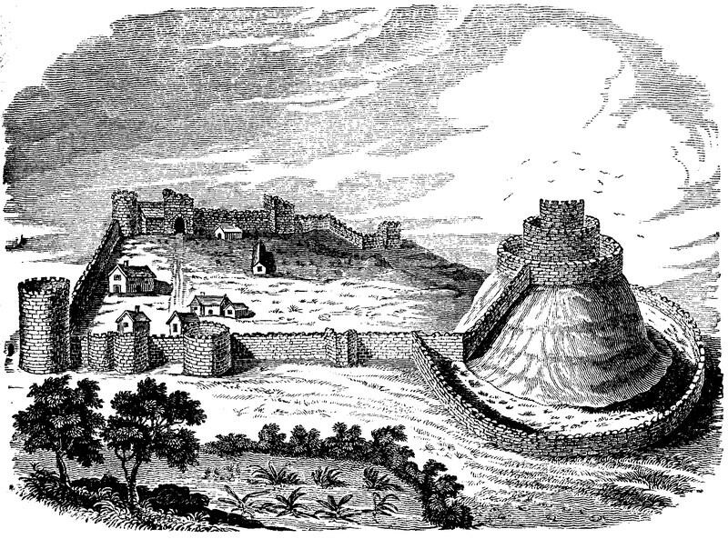 "The principal entrance is on the north-east, the gateway 120 feet long; whence, turning to the right, you mount a terrace, running parallel to the rampart till you come to the angle, on which there is a round tower, now called the Witches' Tower, from which the terrace runs away to the left at right angles, and continues on a level parallel to the rampart, which is nearly of the thickness of 12 feet, till you come to a semicircular tower, and, as I suppose, a guard-room and gate. From this the ground rises very quick, and, through a passage of seven feet wide, you ascend the covered way betwixt two walls, which are pierced with narrow windows for observation, and yet cover the communication between the base-court and the keep or dungeon. The whole keep is 93 feet diameter; it consisted of three wards: the wall of the first ward was not quite three feet thick; and therefore, I think, could only be a parapet for soldiers to fight from, and defend the brow of the hill. Six feet within it stands the second wall, which is twelve feet thick, and has a staircase three feet wide, at the left hand of the entrance, running up to the top of the rampart; the entrance of this staircase has a round arch of stone over it. Passing on to the left, you find the entrance into the innermost ward, and on the left of that entrance a winding staircase conducts you to the top of the innermost rampart; the wall of which is 10 feet thick, and 32 feet high from the floor; the inner room is 18 feet 6 inches diameter; it was divided by a planking into two rooms. The upper room had to the east and west two large openings, which were both windows and (as I am inclined to think) doors, also in time of action to pass from this dungeon out upon the principal rampart, from which the chief defence was to be made; for it must be observed, that the second ward was covered with a flat roof, at the height of that rampart, which made the area very roomy and convenient for numbers. These openings, therefore, upon occasion, served as passages for the soldiers to go from one rampart to the other. In the upper room of the innermost building there was a chimney to the north; underneath there was a dungeon, which had no lights. The lofty taper hill, on which this strong keep is built, is partly natural and partly artificial. It spread farther in the town anciently than it does now; and, by the radius of it, was 320 feet diameter, and very high."