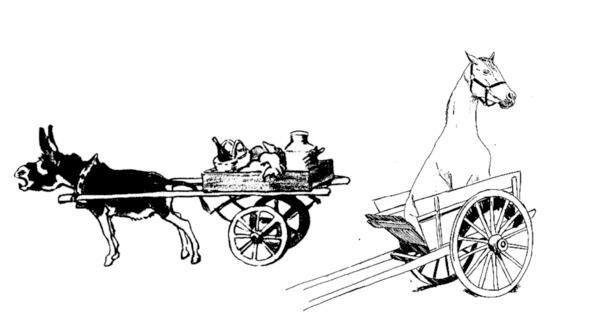 И ослика с иллюстрации, нет в наличии. Мы сами можем превратиться в такого ослика, только телега будет расположена со стороны морды, перед нами.
