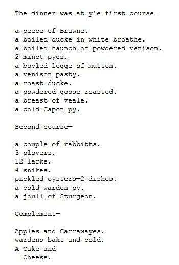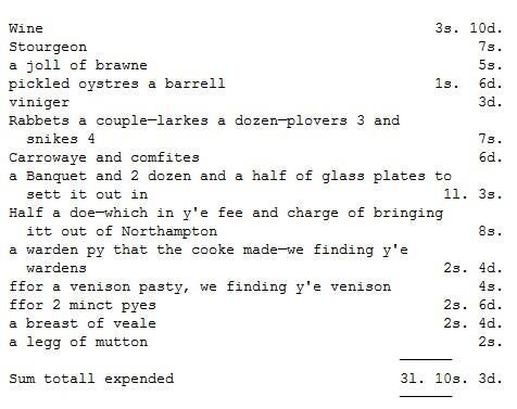 Mem'dwe had out of y'e country y'e goose, y'e duckes, y'e capon py, y'e Cake and wardens, and y'e venison; but that is allways p'd for, though given."