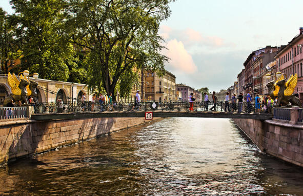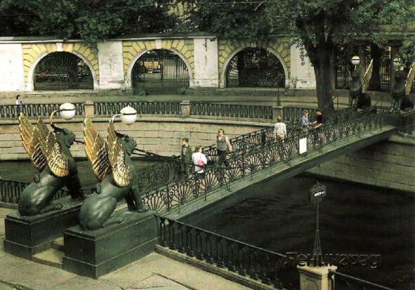 Подвесной мост получил название по находящемуся рядом зданию быв. Ассигнационного банка (ныне там Государственный экономический университет). Мост построен в 1826г. В 1952 был заменен металлическим.