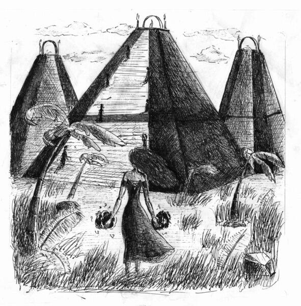 Это было ужасно. Я попала в какое-то дикое, страшное и странное место. Надо мной нависали черные каменные пирамиды, они поражали своим размером и мощью и казалось вот вот обрушатся на тебя со всей своей силой. Небо красно-оранжевого цвета, заслоненное, как рваным одеялом, серыми свинцовыми тучами, наполняло душу страхом и трепетом одновременно. Волос коснулся легкий ветерок, пробежал по коже, и от этого дуновения я поняла, что одета во что-то длинное. Оказалось, на мне было черное вечернее платье, юбку которого всколыхнуло порывом. Откуда оно на мне? Помню, ложилась в постель в одной футболке и нижнем белье. Мысли в голове плыли медленно, как в тумане, немного тошнило. Кожей ощущался влажный и липкий воздух. Здесь было жарко. Покрутив головой, осмотрелась. Пейзаж напоминал мне какую-то компьютерную игру. Помимо пирамид повсюду росли пальмы и прочая густая растительность, сочного зеленого цвета, всевозможных оттенков. Наверное это просто сон. Неожиданно, откуда-то сзади, донесся короткий высокий звук, но обернуться я не успела.
