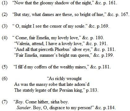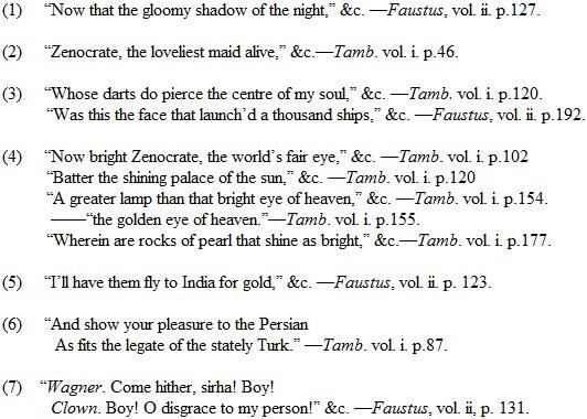 I regret that my communication (No. 13. p. 194.), on the subject of the authorship of The Taming of a Shrew, was too late to be of any avail for the already-published new edition of Marlowes works; and, had I been aware of such being the case, I should have waited until I had had an opportunity of seeing a work whose editor may entertain views in ignorance of which, to my disadvantage, I am still writing. It is, perhaps, a still greater disadvantage that I should appear to depend for proofs upon a bare enumeration of parallel passages; when I know that the space I should require for the purposes of stating the case fully and fairly, and, as I think, conclusively, would be utterly inconsistent with that brevity which must be with you an essential condition; while, at the same time, I know of no medium through which I am so likely to enlist the attention of a fit audience as your publication. Premising that my references are to The Taming of a Shrew in Six Old Plays, 1799, and to Marlowes Works, edit. 1826, I proceed to indicate such passages as a rapid glance through the respective works, aided by some previous acquaintance with the subject, and a not very bad memory, furnished. Some of the parallels will be found identical; in others, the metaphors will be found to be the same, with the expression more or less varied; and in others, again, particular expressions are the same, though the tenor of the phrase be different. It will be observed that the quotations of Marlowe are exclusively from Dr. Faustus and Tamburlaine. Of the longer passages I have given merely the first line for reference; and I have numbered them for the convenience of comparison: