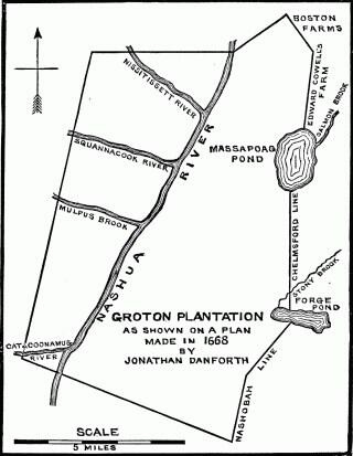 By The Hon. Samuel Abbott Green, M.DThe original grant of the township of Groton was made by the General Court, on May 25, 1655, and gave to the proprietors a tract of land eight miles square; though during the next year this was modified so that its shape varied somewhat from the first plan. It comprised all of what is now Groton and Ayer, nearly all of Pepperell and Shirley, large parts of Dunstable and Littleton, smaller parts of Harvard and Westford, Massachusetts, and a portion of Nashua, New Hampshire. The grant was taken out of the very wilderness, relatively far from any other town, and standing like a sentinel on the frontiers. Lancaster, fourteen miles away, was its nearest neighbor in the southwesterly direction on the one side; and Andover and Haverhill, twenty and twenty-five miles distant, more or less, in the northeasterly direction on the other. No settlement on the north stood between it and the settlements in Canada. Chelmsford and Billerica were each incorporated about the same time, though a few days later.