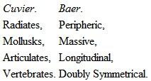 But it is not my object to give all the classifications of different authors here, and I will therefore pass over many noted ones, as those of Burmeister, Milne, Edwards, Siebold and Stannius, Owen, Leuckart, Vogt, Van Beneden, and others, and proceed to give some account of one investigator who did as much for the progress of Zoölogy as Cuvier, though he is comparatively little known among us. Karl Ernst von Baer proposed a classification based, like Cuviers, upon plan; but he recognized what Cuvier failed to perceive,namely, the importance of distinguishing between type (by which he means exactly what Cuvier means by plan) and complication of structure,in other words, between plan and the execution of the plan. He recognized four types, which correspond exactly to Cuviers four plans, though he calls them by different names. Let us compare them.