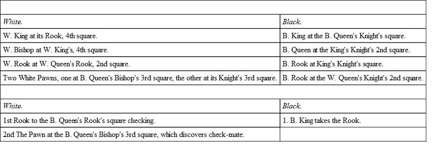 Two Persians had engaged in such deep play, that the whole fortune of one was gained by his opponent. He who played the white was the ruined man, and, made desperate by his loss, offered his favourite wife as his last stake. The game was carried on until he would have been check-mated by his adversary's next move. The lady, who had observed the game from the window above, cried out to her husband, "to sacrifice his castle and save his wife."