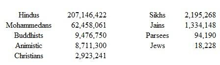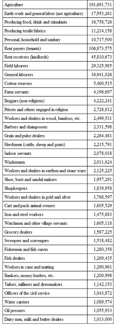 Among the curiosities of the census we find that 603,741 people are engaged in making and selling sweetmeats, and 550,241 in selling cardamon seeds and betel leaves, and 548,829 in manufacturing and selling bangles, necklaces, beads and sacred threads. There are 497,509 teachers and professors, 562,055 actors, singers and dancers, 520,044 doctors and 279,646 lawyers.