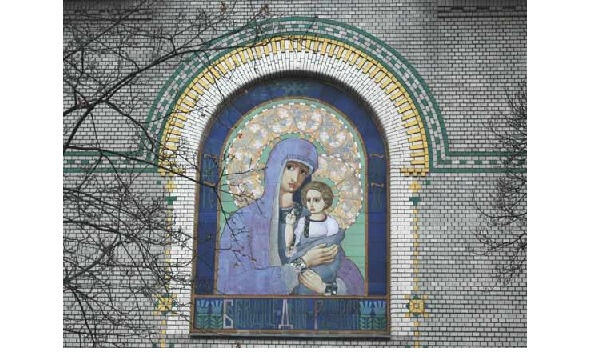 * Майоликовый образ «Богоматерь с младенцем» по эскизу Петрова-Водкина на стене церкви Казанской иконы Божьей Матери при Ортопедическом институте. Александровский парк (быв. Парк Ленина), 5.