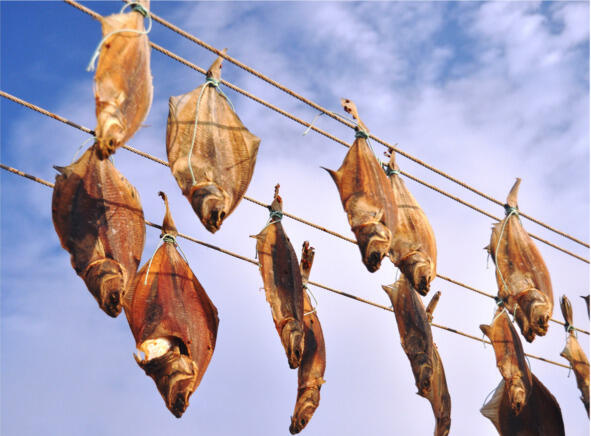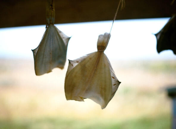 Рядом, под навесом, в тени от солнца. Там уже висело много таких верёвок с рыбой. Камбала на ветру закручивалась и раскручивалась и эта веселая карусель радовала глаз. Мальчик смеялся и показывал Старику на крутящуюся, приветливо машущую плавниками рыбу.