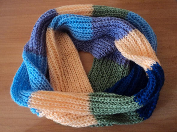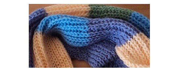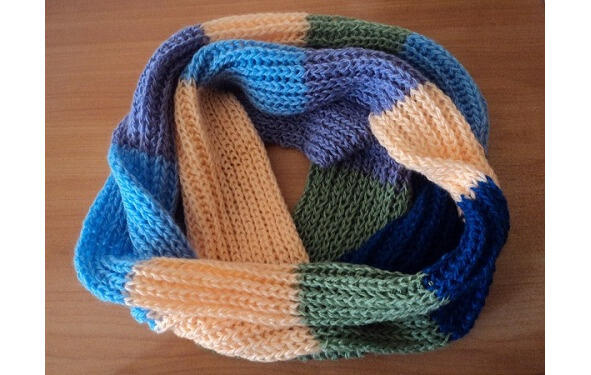 Однажды я собрала все свои клубки, остатки ниток и придумала связать вот такой шарф. Сочетание бежевого цвета, зелёного цвета пожухшей травы, ярко синего и голубого, светло фиолетового, показалось мне интересным. Я свободно меняла нитки на свой вкус. Нет смысла в чёткости, например, вязать строго по 10 сантиметров. Набрала 25 петель, вязала свободно, меняла цвета, комбинировала их до того момента, пока все клубки не закончились.