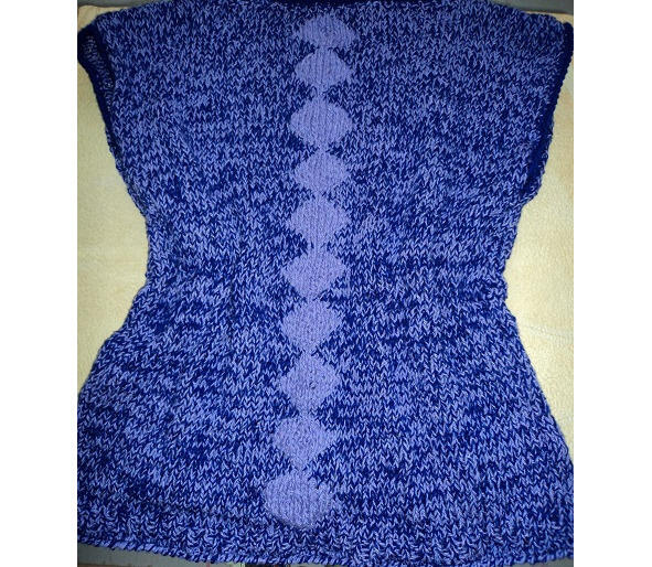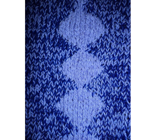 Ромбы вязать несложно. Можно сделать несколько фрагментов по центру переда, можно так, как сделала я, по всей длине изделия. Начинаем с одной петли голубого цвета (два сложения, чтобы по толщине совпадало с двумя нитями основного полотна) в лицевом ряду.