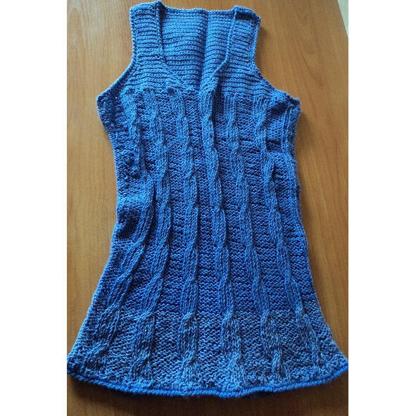 Сначала вяжем прямоугольник изнаночной гладью с «косами». На рисунке косы из четырёх петель, перекрещиваемые в каждом десятом лицевом ряду. Расстояние между «косами» 6 петель. В лицевом ряду вяжем их изнаночными петлями, а в изнаночном ряду лицевыми петлями. Таким образом, и получается эффект «косы» на изнаночной глади. Спинка связана также с «косами», как и передняя часть изделия.