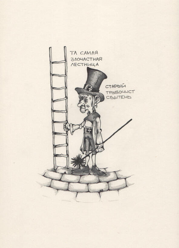 Дальше выше по улице навстречу шёл старый трубочист Сбытень. Худой и длинный, как кочерга, он нёс свою длиннющую лестницу. Лад был так увлечён своими мыслями о предстоящих подвигах, что поздно заметил старого трубочиста и налетел на его лестницу. Сбытень потерял равновесие, стал выписывать забавные кренделя ногами и, круто закрутившись, краем лестницы заехал в окно ближайшего дома. Оттуда послышался звон разбиваемой посуды и ругань жильца. Старый трубочист, растерянно оглядываясь, сердито прикрикнул на Малютку: