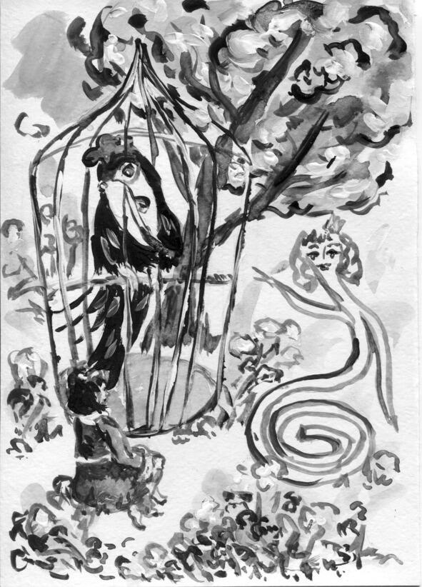 Огромная птица сидела, прикованная цепью к жердочке, в середине большой клетки. А сама клетка была так велика, что занимала половину сада. На голове птицы красовался желтый гребешок, как у петуха, а клюв был огромен, как у тукана. (Если ты не знаешь, кто такой тукан, ты не заслуживаешь того, чтобы побывать еще раз в Зоологическом саду.)
