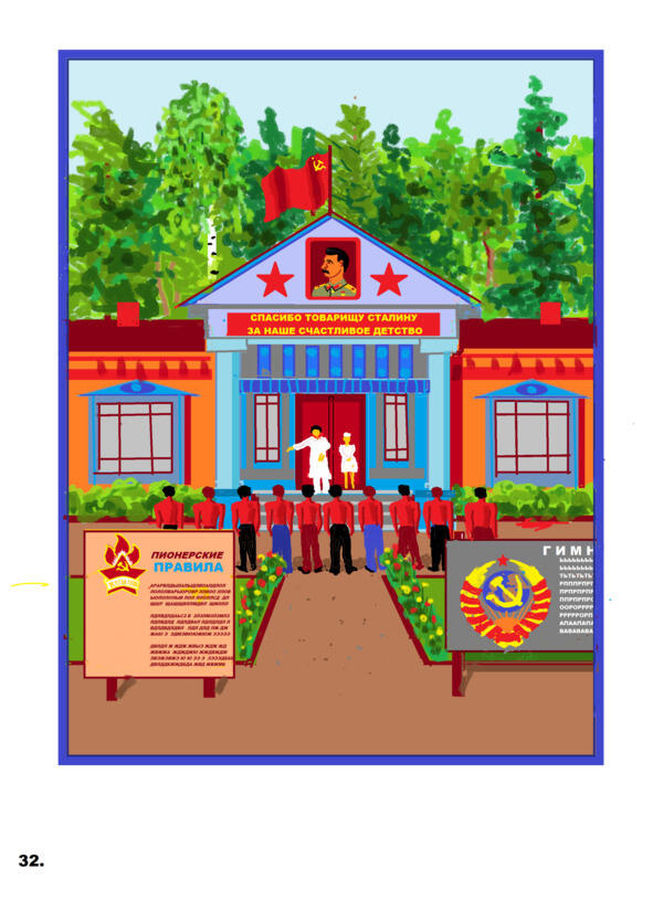 Перед главным зданием располагалась площадка с высоким флагштоком в центре. Здесь, очевидно, проводились утренние линейки и поднимался красный флаг. При входе на площадку стоял щит, на котором были размещены объявления и документы: расписание работы различных кружков, турнирная таблица волейбольных соревнований, пионерские правила и еще что-то. Теперь все это было мусором.