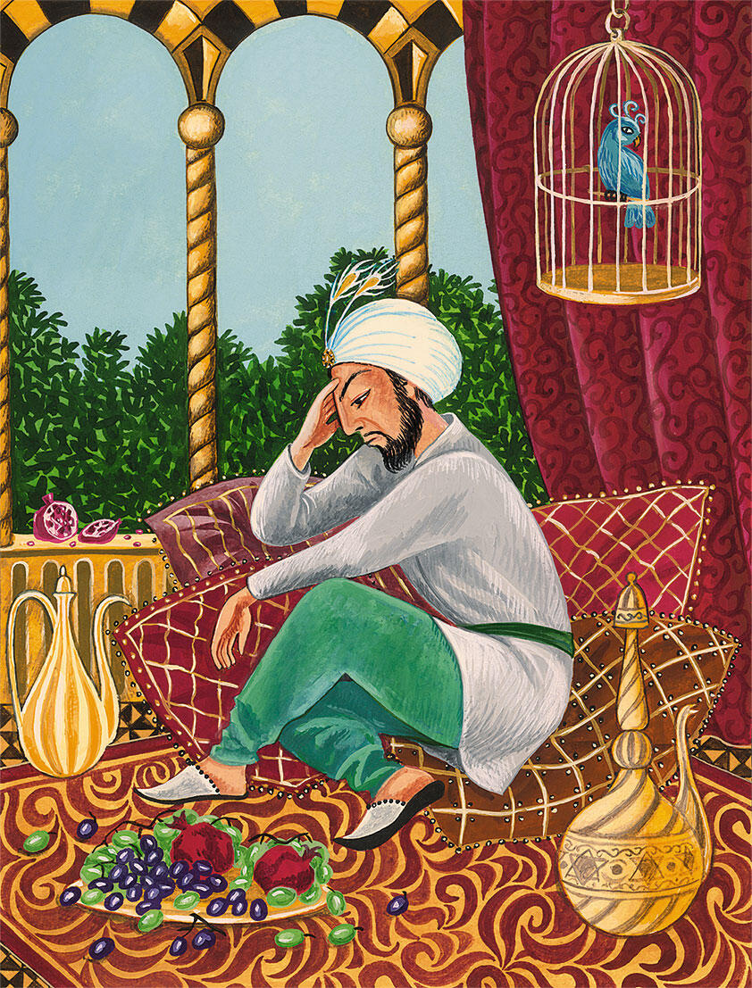 Однажды калиф Гарун-аль-Рашид сидел в своём дворце, погружённый в глубокую печаль, хотя и сам бы не мог объяснить причину подобного настроения. В это время к нему явился великий визирь Джафар. Он почтительно остановился и, лишь убедившись, что калиф его не замечает, осмелился первым заговорить с ним.