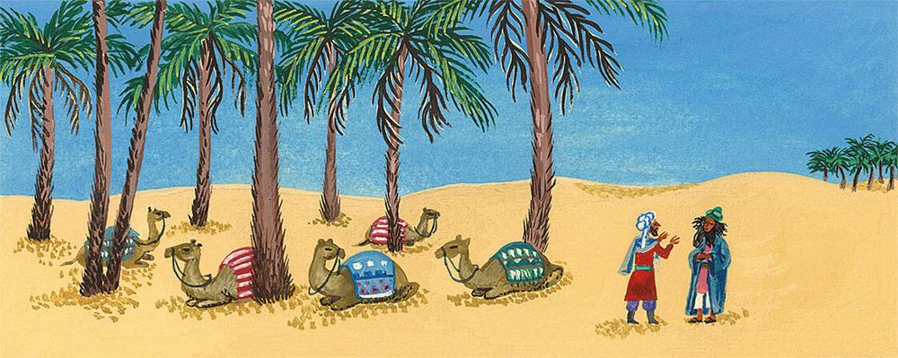 Однажды, сдав в Бальсоре порученный мне купцами груз, я возвращался домой. День был жаркий, и, заметив недалеко от дороги прохладную рощицу, я решил дать небольшой отдых и себе, и своим верблюдам. Скоро ко мне присоединился старый дервиш, шедший пешком из Бальсоры. Мы познакомились и мало-помалу откровенно разговорились о своих делах. И дервиш рассказал мне, что здесь неподалёку находится место, где спрятано такое громадное сокровище, что если бы им нагрузить всех моих восемьдесят верблюдов, то и тогда трудно было бы заметить его уменьшение. Слова дервиша и поразили меня, и привели в неописуемый восторг. Я воскликнул с жаром: «Добрый дервиш, я ведь вижу, что тебя мало интересуют блага сего мира: зачем же тебе скрывать тайну этого сокровища? Ты один, и потому тебе оттуда много не унести. Покажи мне место, где они лежат, и я нагружу ими своих верблюдов, а в благодарность за оказанную услугу я подарю тебе одного из навьюченных верблюдов».