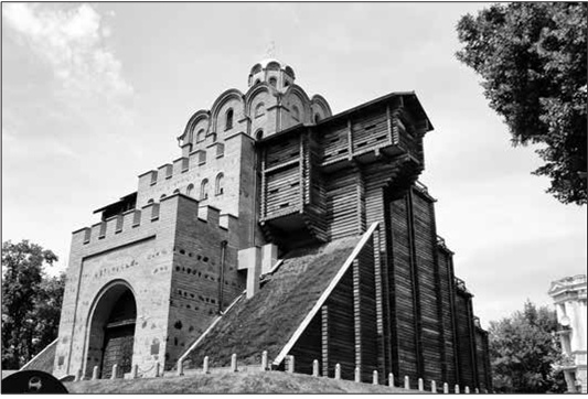 В город Ярослава вело трое ворот. Главный вход в город Золотые ворота; они находились на южной стороне вала. Развалины Золотых ворот сейчас скрыты за каменными имитациями ворот и стены, стилизованными под Киевскую старину. К концу XIV в. ворота уже были основательно разрушены, но остатки надвратной Благовещенской церкви над ними еще сохранялись. Однако даже в XVII в. через руины Золотых ворот торжественно въезжал в Киев Богдан Хмельницкий. От Золотых ворот улица вела прямо к митрополичьему дому и собору Св. Софии, как и в Константинополе. Перед собором стояли две церкви: слева церковь Св. Георгия, покровителя Ярослава, справа церковь Св. Ирины, покровительницы его жены, шведки Ингигерды, при крещении принявшей имя Ирина. Левее Георгиевской находилась ещё одна каменная церковь, название которой не сохранилось.
